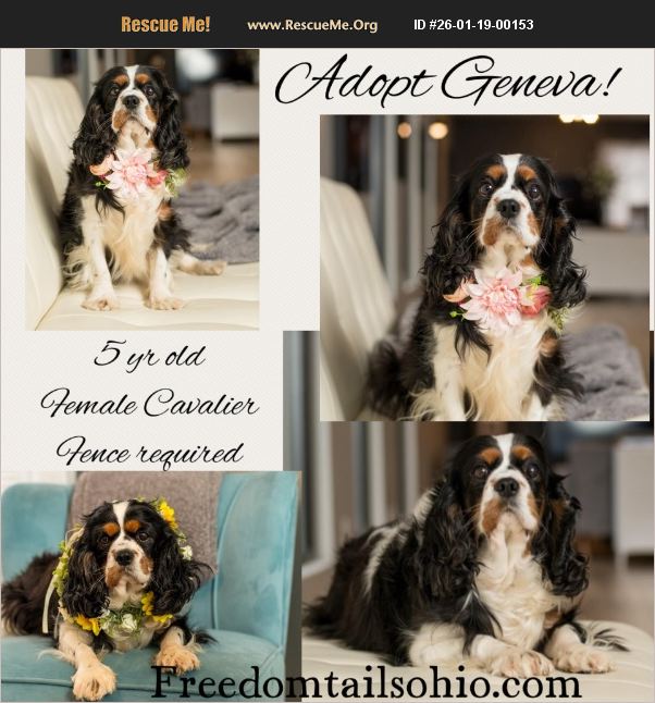 Adopt Geneva Cavalier King Charles Spaniel Female 5 years old 32lbs Meet your new best friend Geneva! She should be called Jolly because she is always so happy! She is a lover girl & human hugs are her favorite. She is learning how to live in a house & asks for her future family to be patient as she continues to learn. Once asleep she sleeps quietly in her crate at night except for the occasional snoring ��%BD��%BD��%BD��%BD. She is loving everything about living in a home & is enjoying toy dog bones ��%BD��%BD|��%BD to chew along with bringing dog toys to the couch. Her favorite thing is to just be loved & adored by her humans! She will do best in a house where someone is home with her often as she thrives on human companionship. She is on the larger size for a cavalier, but with regular exercise and nutrition she will feel her very best self! It just means there is more of her to love on ��%BD%9D%A4��%BD��%BD%8F She has only a few potty accidents when taken outside on a regular schedule. She wants to stay close to her people & follows her foster mom all throughout the house. Though she is extremely loving & friendly, she still needs lots of patience and understanding as she adapts to her new life. Geneva is not cat tested. She is fully vetted, microchipped, & had a dental completed. Her future home can include responsible older children (elementary age and above) to help her continue to blossom & provide her more love/ attention. She gets along fine with all of the dogs in her foster home, but doesn't seem to need another dog in her future home. Geneva is such a happy girl & her tails always wagging for us ��%BD%9D%A4��%BD��%BD%8FAnyone would be so lucky to adopt this sweetheart! Apply for Geneva at freedomtailsohio.com
