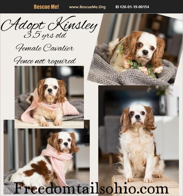 Female 3.5 years old 15lbs Meet Kinsley your next snuggle buddy! She is a sweet & loving Blenheim cavalier King Charles spaniel that used to live in a barn for breeding. One of her favorite things is to snooze on the couch snuggled close to her foster parents. She is very sweet & is figuring out what safety & love feel like for the first time. Kinsley has become her foster mom's little shadow following her wherever she goes. She needs a patient, kind, and understanding future home as she adapts to life outside the breeding world. Since being rescued her playful side is coming out more. She loves to do somersaults on the carpet and do stretches/yoga ���� She loves to run around in our fenced backyard with her foster Cavalier siblings. Kinsley would benefit having another friendly & gentle dog in her future home so she can continue to blossom. Kinsley will do best in a quieter home with no little children since she is nervous around sudden unpredictable situations. Responsible children 10 years old and above would be best for her future home. She is crate trained and has few potty accidents when taken out on a regular basis. No fence is required as she is making great progress walking on a leash. She is not cat tested. She is fully vetted, microchipped, & had a dental completed. Kinsley is being fostered in Powell, Ohio. Apply for Kinsley at freedomtailsohio.com See less