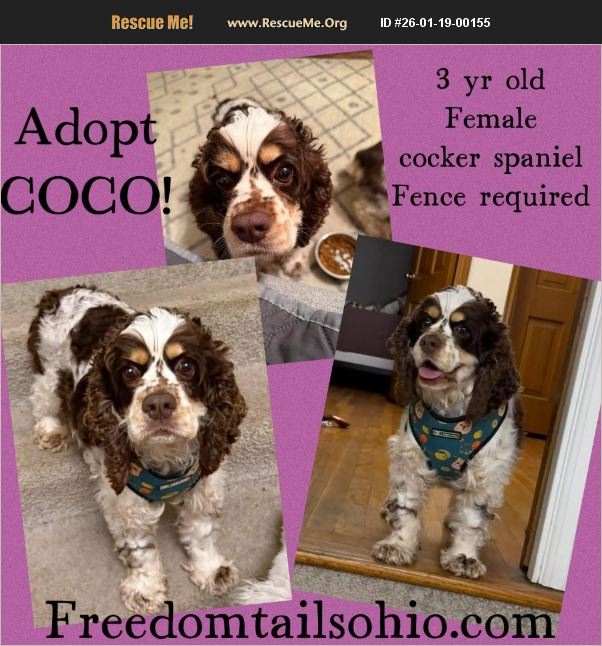 Adopt Coco! 3 year old Cocker Spaniel 25 pounds Good with other dogs and cats. Fence required due to wanting to flee with loud sounds and learning to walkon a leash. Coco is a 3-year-old Cocker Spaniel who is still learning that the world (and the people in it) can be kind. She is very shy but beneath her quiet exterior is a sweet, sensitive girl who is trying very hard to learn how to trust. Coco will need a calm, peaceful home with an experienced and patient adopter who understands that trust must be earned on her terms. She is not a dog who can be rushed. Coco chooses when and how she feels safe, and right now she will only accept pets when she is the one to approach you. But when she does, it feels like a small victory worth celebrating. Despite her shyness, Coco has made remarkable progress in a short amount of time. Each day, she grows a little braver, a little more curious, and a little more confident in her surroundings. Having another small, confident dog in the home is essential, as she learns best by watching her foster siblings and following their lead. Coco is crate trained, continues to work on learning everyday 'dog' routines, and is doing well with a consistent schedule. She may be quiet and reserved, but her progress speaks volumes about her resilience and potential. Coco is looking for a very special home that values patience, celebrates small milestones, and understands that the deepest bonds are often built slowly, one gentle moment at a time. Coco can be adopted with her sister zoe but not required Apply at freedomtailsohio.com
