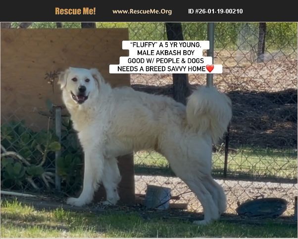 Courtesy Posting: 'FLUFFY' Agoura Hills, CA STUNNING MALE AKBASH HAS BEEN WORKING WITH A TRAINER. GOOD W/ DOGS AND PEOPLE - NEEDS A BREED SAVVY HOME - WAS SAVED FROM BEING EUTHANIZED FOR SPACE AT A LOCAL SHELTER. Gorgeous 'Fluffy' is a 5 yr young male Akbash (Turkish Guardian Breed) who was rescued just-in-time from being euthanized for space at a local shelter. Fluffy has been working with a trainer and is good with both people and dogs. This pup needs a breed savvy home. If you are interested in adopting him, please email me directly at: [email protected] We will be updating this Facebook post with new pictures and photos upon receipt: https://www.facebook.com/783968124/posts/10168386401358125/?mibextid=wwXIfr Note: to view contents of links you will need to copy and paste each one separately into your browser.