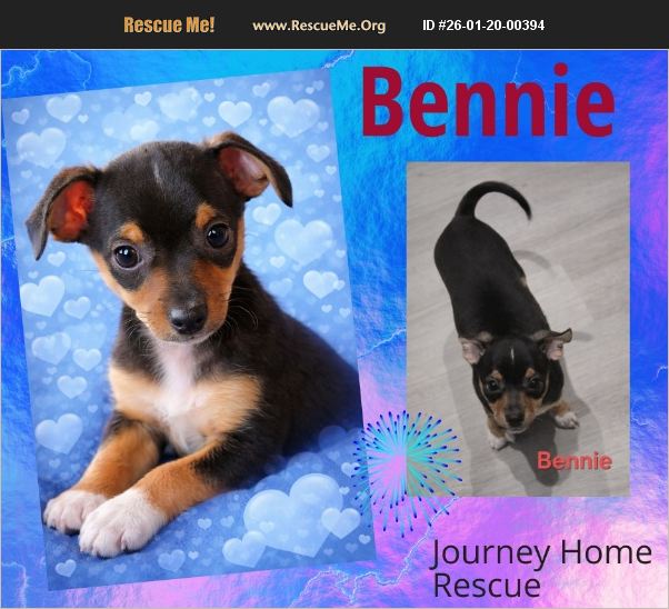 ennie loves playtime, he loves jumping.He's extremely energetic.He is a sweet, happy, playful boy, very social. Bennie is all boy! At 11 weeks old, Bennie the Chihuahua mix is 5.9lbs. Bennie is located in the Pacific Northwest. Bennie will have his final vet check on January 19th. Transport available for approved adoption. Please email the rescue at [email protected] for more information