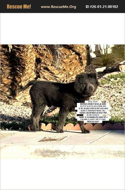 Courtesy Posting: CODE RED/EUTH LISTED- 1/23 DEADLINE at 3 pm!!! LAS VEGAS, NV - ID #A1405990 'BEAR' AT THE ANIMAL FOUNDATION SHELTER KNOWN TO EUTHANIZE MANY CHOWS. BEYOND URGENT MIDDLE AGED/OLDER BLUE/BLACK CHOW BOY (6 yr, 48 lbs) WHO IS SHY AND WAS GENTLE AROUND FINDER, SEE VIDEOS. MADE RESCUE ONLY FOR BEING SCARED. 'BEAR' IS IN IMMEDIATE NEED OF A FINDING A SAVVY FOSTER AND RESCUE ASAP- do not contact the shelter unless you are a rescue group, PLEASE CONTACT ROBIN MORGAN IF YOU CAN HELP: [email protected] Rescues need a foster and local help to save Please help us find a savvy foster (or foster to adopt) and rescue for this dear neglected boy who seems to have been dumped near North Las Vegas. He was seen laying on a sidewalk and hanging out near a specific home and area where he would return. Someone who saw him brought him some water and treats to earn his trust, and provided us many videos showing a shy dog. The finder contacted us and said, 'I know he is a great dog deep down he just needs love and time'. Animal control showed up, and rather let the lady/finder continue to work to gain his trust, they claimed he was dangerous and that someone reported he was chasing children (which we doubt, given his shy demeanor). So, instead, they chased him and used a catch pole to catch him, scaring him even further. Now at the Animal Foundation who euthanizes many chows and never makes many available even to rescues, they have decided to give this boy a chance at being rescued, but placed him on a very short deadline of 1/23 at 3 pm. We are therefore in urgent need of finding a savvy foster too. He cannot be adopted directly from the shelter, he requires a rescue partner to pull him out to save his life. Again, rescues need a place for a dog to go to save him and thus we need a foster and local help. They have named him Bear and estimated he is 6 years old. He is only 48 lbs and has thinning fur, likely from fleas and lack of proper nutrition and care. The shelter listing states, 'Bear is not adapting well to the shelter environment and exhibiting signs of fear and kennel distress. Bear was found running the streets chasing after children. He was a no handle on intake here at the shelter when he was brought in. In the kennel, he is avoiding and growling. Staff has been able to take out and he is nervous and slightly avoiding on the leash. With slow approaches, he tolerates handling, but prefers to be left alone. He is an older boy who just needs time to adjust to new environments. This animal would benefit from a quieter place to adjust and become more comfortable with social and environmental changes. Due to the severity of these behaviors, this animal is transfer only. This animal needs placement by 1/23 at 3 PM' As even the shelter can handle him a little already, and notes he 'just needs time', we will feel this boy will warm up significantly once he feels safe as many chows do. But, we unfortunately have such little time to find a foster and rescue. The deadline is 1/23 at 3 pm and we have requested an extension, but it is not likely any will be given. If you may be able to foster, even temporarily, or help in some other way (transport, pledge towards his rescue and medical), please contact Southern California Chow Chow Rescue Network ASAP at [email protected] who is trying to find immediate placement for him. Time is of the essence. If you are a rescue group interested in rescuing, please contact the shelter's Rescue/Transfer department at [email protected] asap and note his ID and your intentions on the subject line, but also contact us. The Animal Foundation may also be reached at (702) 384-3333 or (702) 955-5932 (main line). We will be posting more pictures, videos and updates also on facebook at: https://www.facebook.com/debbie.alder.14/posts/pfbid0CmwSzmALMMRkGfnvVMNc5nH73R9YsMcNpv34up7F2gQ6GGeJrybUq9KRDMcrAgoHl Bear's listing link: https://animalfoundation.com/adoption/a1405990/ Note: to view contents of links you will need to copy and paste each one separately into your browser.