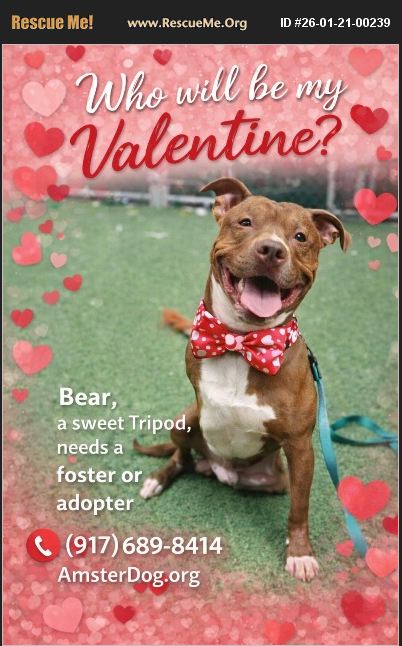 BEAR IS LOOKING FOR HIS FOREVER VALENTINE! A Prayer for Bear . This Valentine's Day, this post is going out with a prayer that Bear's angel is out there and finally takes him home. Bear's story is one of heartbreak, survival, and a love that refused to be extinguished. What he lacks in legs, this sweet, resilient boy makes up for in spirit, soul, and the biggest heart imaginable. Bear is 4 years old, about 65 lbs of pure gentle loyalty, and a proud, brave 3-legged tripod who moves through life like a miracle on paws. As a puppy, Bear lost his front right leg after a vicious dog attack. And yet, just like the orthopedic specialist once said: 'Dogs are born with three legs and a spare.' They adapt. They heal. They carry on. But Bear's pain didn't end there. In December 2023, Bear was surrendered to the city shelter two days before Christmas, with fresh dog bites on his muzzle and back from yet another attack. He spent the holidays scared and alone - yet still became a staff favorite, melting hearts even in the darkest place. Then came his first real miracle. In March 2024, Bear left the shelter and entered a foster home, where he has remained ever since - described as the 'perfect guest.'No barking. No whining. Just gentle gratitude. Bear loves to play more than a walk, balls are his favorite, but his stuffed animals are his treasures. He will carry them on adventures, not because he needs them but because he loves them that much. He carries them proudly in his mouth like little love letters he never wants to drop. Bear is the kind of dog who: Leans in for kisses, Gives gentle, loyal eye contact like he already trusts you, Plays like a happy, goofy kid, Snuggles like a soulmate And is even good in the bath. Recently, Bear underwent Rectal Prolapse Repair . He is healthy now and healing beautifully. At the moment, he is using wee-wee pads while everything fully heals and his body readjusts. Part of his recovery journey. His foster has lovingly supported him through his entire journey, but due to changes in her personal circumstances, she is no longer able to continue housing him. This has nothing to do with Bear he has been an amazing boy. Bear does well meeting other dogs, but due to his past trauma, he should be the only dog in the home. He is non-reactive, gentle, and people-loving . Bear needs a human who understands that healing isn't always linear. A home where love doesn't come with conditions. A person who sees resilience as beautiful, not inconvenient. Bear's Personality: Quiet, gentle, loyal , Couch potato champion Affectionate, friendly, playful ,Smart, food-motivated Gentle with people, kids, dogs and cats. Loves kisses, loves kisses, loves more kisses . A snuggler, a kisser, a toy-carrier, a spirit-lifter . The ulti-MUTT Valentine companion Contact: Kat 516-457-3678 . The Rescue will cover all medical costs. Bear's medical issues have been addressed he is healthy now and just needs love and time to finish healing. Every dog deserves a better ending than the beginning they were given. Now Bear just needs one person to make it real. His angel. His miracle. His forever Valentine. Warning: You will fall in love with this one-of-a-kind diamond BEAR.