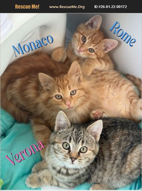 Queen Vienna's Royal Trio These 9-week-old kittens will soon be ready to claim their forever kingdoms Rome Rome is the undeniable leader of the pack and the court jester all in one. He's a total comedian with a big personality, purrs on command, and has never met a toy he didn't love. Confident, playful, and incredibly cuddly, Rome is always the first to explore and the first to charm his way into your heart. Verona Verona is our elegant princess. Independent and poised, she believes affection should be earned. But once you do, it's oh so rewarding. She adores her brothers, goes wild for string toys, and truly enjoys gentle pets. A perfect mix of regal and playful, Verona brings grace to the group. Monaco long hair Monaco is the gentle soul of the trio. Sweet, calm, and affectionate, he loves being pet and will happily roll over to show his belly once he feels safe. A purring prince through and through, you'll often find him curled up with his siblings or gracefully chasing a wand toy. These three royal heirs are ready to blossom into incredible companions. They'll just need an adopter willing to offer patience, love, and a safe space to grow. Trust us, it will be more than worth the wait Priority will be given to those interested in a pair/trio or with another young kitty at home