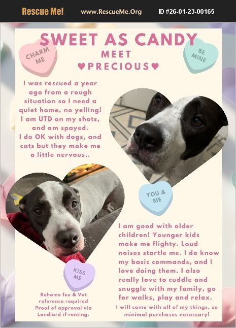 She's extremely lovable. Loves to go on walks and just be around people. She's good with her family but protective against others. She came from an abusive home so she doesn't like a lot of yelling. She'll come with everything she needsz