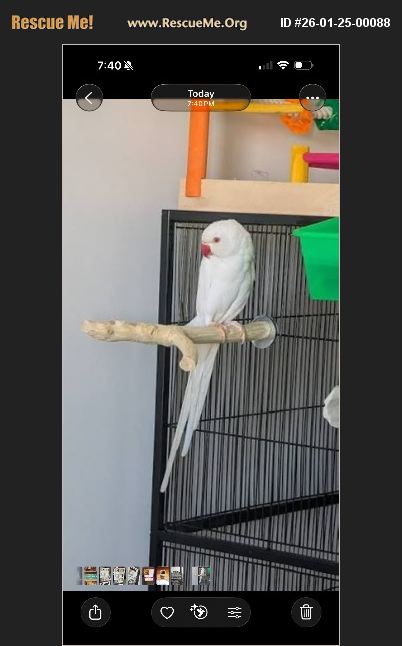 Indian Ringnecks are intelligent, expressive parrots who thrive with patience, enrichment, and consistent interaction. She would do best in a home that understands the commitment these birds require and is ready to give her the time, space, and stimulation she deserves. She will need some work, she can be held. Asking $500 obo she is around 3