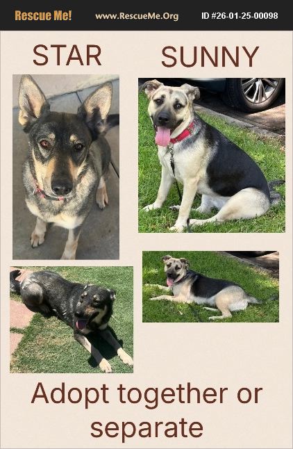 Both are spayed have their shots, have basic command training are under 2 years old�%A0�%A0and are good with kids and other dogs. Not sure about cats. Photos 1 to 3 are STAR and 4 to 6 are SUNNY. I'm inquiring if you know anyone that would�%A0�%A0be interested in CA or out of state in taking them?�%A0�%A0I will pay for their transport. I've had them several months and have STAR boarded and�%A0�%A0SUNNY with a paid foster. Im 81 and plan to go into assisted living and need to find homes for these 2 girls. Can you assist in any way or know of anyone that might help? Please let me know. Andrea Richard, [email protected] 949 244-9677