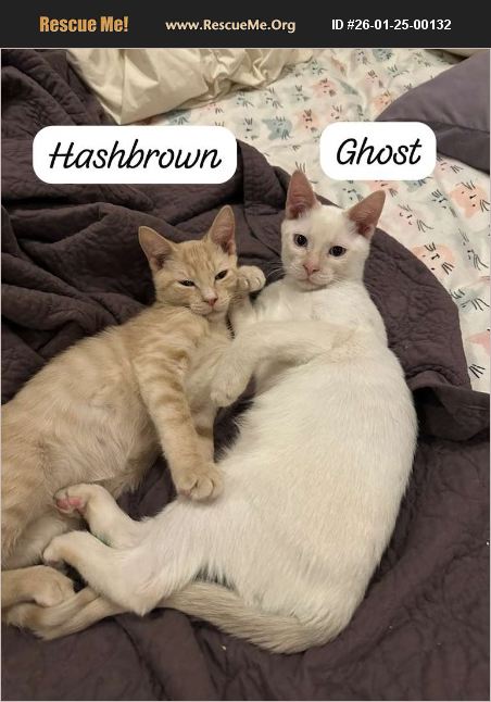 Ghost and Hashbrown Ghost (white kitten) and Hashbrown are ready to find their forever home together. Ghost is a little more independent and adventurous, while Hashbrown is a total mama's boy - incredibly loving, affectionate, and sweet. Together they balance each other perfectly and are guaranteed to bring nonstop cuddles and fun. We are hoping someone would welcome both of these boys in their home together Age: 4-5 months old