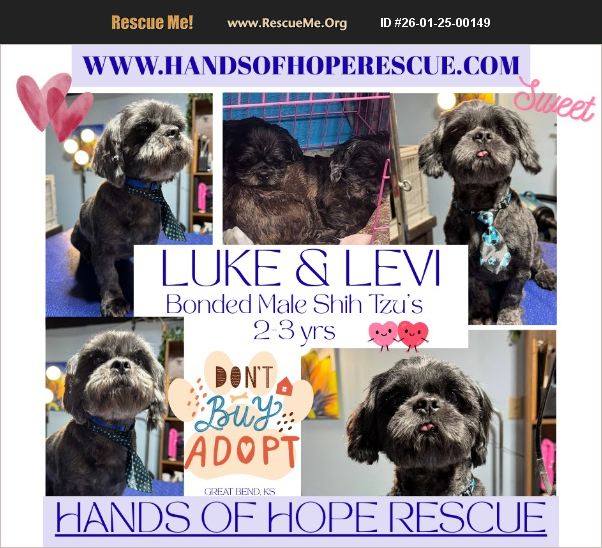 Meet the adorable Luke and Levi! They are male, 2-3 yr old, Shih Tzu's that were dumped by a breeder. These two are the sweetest guys and very playful! They both are a bit skiddish but Luke is a bit less. Once he warms up to you, he becomes an attention hound! He loves playing with his brother, and even though he is the smaller of the two, he likes to think he's in charge! He is very protective and vocal about it! Luke recently had emergency surgery Christmas Eve to remove three bladder stones! He is fully recovered and doing well but will need to eat a special food. Levi is the larger one and more skiddish than his brother. He is a bit more afraid of new people and will run and hide from loud noises. He ADORES pillows and once he trusts you he will try to sleep up next to your head! He needs patients as he is more the time taker when it comes to using the bathroom and other activities. He knows his name and when called gives full attention! Both Luke and Levi and smart and have learned to use the doggy door. They will need regular grooming so if you cannot have that done for them you need not apply. These boys were neglected and deserve a home that will give them the care and love they deserve. They are both neutered, current on all vaccinations, heart worm negative and microchipped. They must be adopted together as they are bonded an application to give them a forever home can be done on our website at www.handsofhoperescue.com.