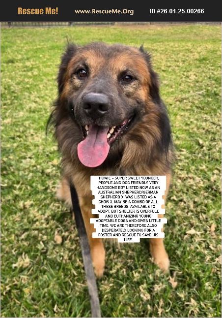 Courtesy Posting: HELP!!! X URGENT- Riverside County Shelter, Jurupa Valley location So Cal - ID #A1896233 'HOWIE'- SUPER SWEET YOUNGER, PEOPLE AND DOG FRIENDLY, VERY HANDSOME BOY LISTED NOW AS AN AUSTRALIAN SHEPHERD/GERMAN SHEPHERD X, WAS LISTED AS A CHOW X, may be a combo of all these breeds AT GREAT RISK IN HIGH KILL SHELTER. AVAILABLE TO ADOPT, BUT SHELTER IS OVERFULL and EUTHANIZING YOUNG ADOPTABLE DOGS AND GIVES LITTLE TIME. WE ARE THEREFORE ALSO DESPERATELY LOOKING FOR A FOSTER AND RESCUE TO SAVE HIS LIFE. RESCUES NEED FOSTERS TO HELP! DEAR HOWIE was walked into the shelter with a similar looking friend on 1/17, and said to be found as a stray. His/their owner sadly never showed. He has been kenneled with his other friend, Gordy, as well as another unrelated dog, Max, all who do well together, and dog and people friendly, and have no reported issues at this time. They dogs do not need to be adopted together, although if you could, even better. We have separate posts up for the others with links also below. Howie is said to be 4 years young and weighs 52 lbs now, his friend Gordy is 56 lbs, and other kennelmate Max is 61 lbs and thought to be 2 years old. We have nice videos of these dogs we will be posting on facebook. Therefore, if you are interested in adopting sweet Howie or any others, please contact the shelter immediately by calling: (951) 358-7387 and reference his applicable ID and also use his listing link to express interest. If you are interested just to foster, or foster to adopt, or if you need further help, please contact [email protected] or Southern California Chow Chow Rescue Network asap as we are trying to find fosters we can then refer to a rescue group to save him in time. There is also a chance he could be fostered through the shelter if you are local, or we could pair you with a rescue group to assist with this as a foster if you are further away (but not too far from a willing rescue). If you are a rescue group and interested in pulling this handsome guy, please email the shelter right away at: [email protected] and call: (951) 358-7302. We will be posting additional information, pictures and video for Howie on facebook at: https://www.facebook.com/783968124/posts/10168416317523125/?mibextid=wwXIfr Gordy's facebook: https://m.facebook.com/story.php?story_fbid=10168416715793125&id=783968124&mibextid=wwXIfr Max's facebook: Gordy on facebook at: https://m.facebook.com/story.php?story_fbid=10168416715793125&id=783968124&mibextid=wwXIfr Listing Links: https://24Petconnect.com/DetailsMain/RVSD/A1896233 Howie https://24petconnect.com/DetailsMain/RVSD/A1896232 Gordy https://24petconnect.com/DetailsMain/RVSD/A1894416 Max Note: to view contents of links you will need to copy and paste each one separately into your browser.