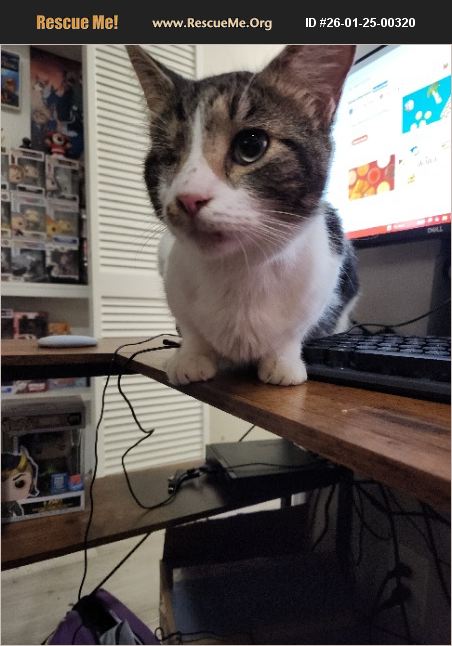 THIS IS NOT MY CAT, SHE IS A STRAY! I have named her Roxy as a place holder but I normally call her 'Kitty ' or even 'Girl'. This is an older cat and she has a few missing teeth and one eye. Shes super sweet, however, I have enough animals. She comes in when it gets stormy or cold... but I cant keep her in because its just not feasible. She is TERRIFIED of the vacuum and gets a little jumpy near it. Meaning she will try to attack it but normally you can calm her down when its OFF. I am trying to find her a home because in reality shes staying by my door and MEOWING every day of the week now. I feed her but I cant keep her in as I said. Shes good with dogs as I have service dogs and good with cats as well but I think she'd do better with adult cats or senior cats. I dont have a vehicle so no, I can not take her anywhere. I just want her to have a safe and warm home.