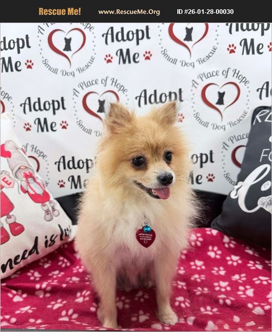 PEGGY is a 6 year old, 6.6 pound Pomeranian surrendered to find a home where she can live as a pet. She is a loving girl who will need a calm home, a predictable routine, and someone who understands that trust takes time. In return, she offers quiet companionship, tail wags, and a heart that wants very much to belong. PEGGY is very sweet and learning a lot of new things about the world about her. Her favorite spot in her foster home is tucked into the couch, with dog beds being a close second. From there, she likes to watch what's going on when her people are moving around, or relax nearby when you're sitting down. If you walk too far away, she won't follow just yet, but she'll softly cry until you come back or bring her with you. She loves to be spoken to sweetly and once she's with you, she's content and calm. She especially loves snuggling on her foster mom's chest while she reads or works, it's one of her favorite ways to feel safe and close. PEGGY coexists well with calm dogs and is happiest with a small quiet companion, but playful, bigger dogs make her nervous. She would likely be fine around cats, as she shows little interest in them. Because of her timid nature, she would do best in a home with no kids or older, respectful children who understand giving her space and moving slowly. PEGGY is still learning the basics of potty training and does not yet understand how to signal when she needs to go outside. With a consistent routine, she will potty outdoors, although she may occasionally choose the patio. If not taken out regularly, she may have an accident where she's been resting, including once on the couch, which we promise she found just as surprising as we did. She will need patience, structure, and understanding as she continues to learn. Outside in the yard, PEGGY loves to quietly follow her person a few feet behind, her tail wagging the whole time. She may trail the other dogs or do a bit of exploring on her own, but her favorite place is always near her human. She does not understand the leash yet, so she's currently being carried in a sling on walks to help her get used to the sights and sounds of the neighborhood. PEGGY seems to feel safest eating in an open kennel, which may give her a sense of comfort and security. At night she sleeps wherever she's placed, whether in a dog bed or with her humans, and settles in easily. PEGGY is spayed, up to date on shots, heartworm negative, has had a ProHeart 12 heartworm prevention shot and is microchipped with a lifetime registration. *To meet or adopt one of our dogs, you must first submit an adoption application for review. Important - check your spam folder for follow up questions and responses from our team. *A Place of Hope Rescue is a foster-based rescue located in Pensacola, Florida. We do not have a physical facility for visits. We adopt within a 6 hour drive to Pensacola. Puppies and dogs with pending vet appointments, and dogs with behavioral or medical issues are only adoptable locally (within 1 hour to Pensacola). We do not ship or transport our dogs. To view our adoptable dogs, find adoption fees, submit an application, and learn more about us, please visit: www.aplaceofhoperescue.com