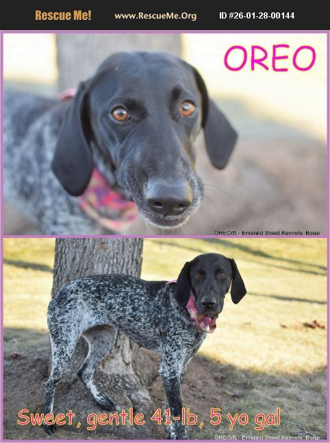 ***NEEDS FOSTER or FOREVER HOME*** Currently in Boise boarding kennels Meet OREO! She is a sweet, gentle 41-lb, 5-year-old German Shorthaired Pointer mix who is a bit confused at her new surroundings. She is looking for a forever home where she can find her confidence again. She seems good with all dogs and people. She walks well on leash and will notice movement in the distance (possible hunting dog?) OREO will be spayed, microchipped and current on vaccines for her forever family. MORE PHOTOS: https://photos.app.goo.gl/ro9keLKFPa6TxwBn6 Complete an easy, online application to meet OREO in Boise. APPLICATION: https://forms.gle/U3UUbdpNzZVpxP9h8 BACKGROUND: OREO and her lab friend were abandoned. The lab went to Idaho Humane Society.