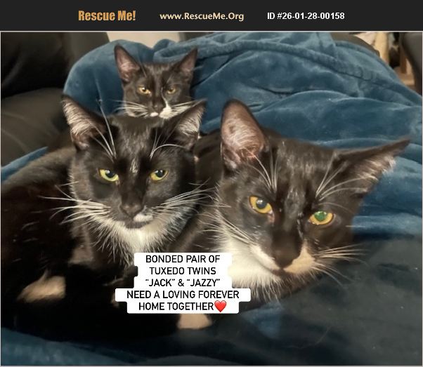 Courtesy Posting: ���%A4��%A4%8D Adopt the Tuxedo Twins Jack and Jazzy Meet this adorable brother and sister Adopt duo - two 8- month-old tuxedo kittens who are as charming as they are cute! Born May 22 2025 These sweet siblings are the perfect mix of playful energy and loving affection. They spend their days chasing toys, wrestling gently with each other, and curling up for cozy naps together. Both are healthy, litter-trained, and have been socialized in a loving home. The little boy Jack is curious and bold, always the first to explore and greet you at the door. He loves attention and to play with mice laser toys. Jack loves sitting in his hammock and playing on a cat tree. He loves to be high up to look out in the yard . Jack loves being pet and is a really People cat where he will be your best friend and just lay with you . He deserves to sleep next to his person. His sister Jazzy is curious and fun getting into mischief with her brother. Jazzy loves playing hide and seek and playing with her laser and mice toys as well as cuddling up with her brother in the cat tree or being on the hammock. Together, they make a wonderful pair - full of love, fun, and personality. They are all fixed, vaccinated, dewormed combo, tested negative, microchipped, socialized and have great personalities. Records available if needed. There is an adoption fee of $150 that covers what she has used for their vetting. They would be happiest adopted together in a home with lots of love and playtime in an inside only good size home.. not an apartment. They are the sweetest cutest pair! Details: �'ۢ 8 months old �'ۢ Domestic short hair tuxedos (black & white) �'ۢ Vet-checked, vaccinated, and litter-trained �'ۢ Playful, affectionate, and well-socialized Bring double the joy into your home - adopt these tuxedo to bring you so much love �%9D%A4��%8F If you are interested in meeting/ adopting these two cuties, please email Kari directly at: [email protected] We have many more adorable pictures of these two on their Facebook page at: https://m.facebook.com/story.php?story_fbid=pfbid02nYQaH6gTvk2giMeftjPWZ345jN1htZxdRwDjGZfR4ocLgTiGETmxeg7EiCdBKbkMl&id=783968124&mibextid=wwXIfr Note: to view the contents of the link, you will need to copy and paste it into your browser.