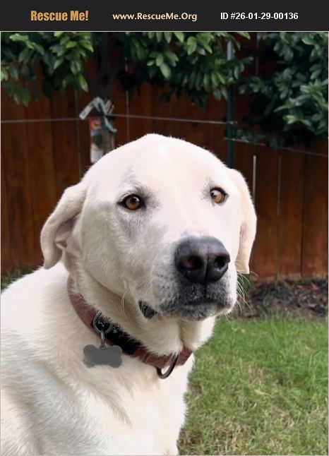 This Gentleman is great with cats and dogs. Meelo is a 4-year-old, ~70 lb Great Pyrenees mix (often mistaken for a white lab). Meelo has deeply expressive eyes and is the most empathetic dog ever! Born on July 23, he is a Leo. Like a true Leo, he is warm, loyal, and protective. He is so patient with other dogs and very respectful of cats. Meelo is house and crate trained, and not a barker, nor reactive. He can be reserved at first, as he likes to test the waters before diving into new experiences. Once he's comfortable, his playful personality shines. He is big on lounging, but does love his walks. As long as he's with his human he is a happy pup. Overall, he's just a big goofball. Due to allergies in the household we have to re-home him. We will provide his medical records, food and his favorite treats to make his transition into a new home as smooth as possible. We want to make sure he goes to a loving home.