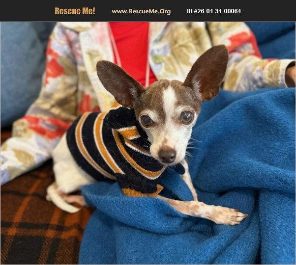 Kiki is a sweet Chi mix, very friendly and loves to sit on your lap. Her owner had to go into dementia care. She sleeps in a crate at night and does use pee pads during the day until she gets adjusted to your schedule. Seniors fee only $100 and Veterans $0