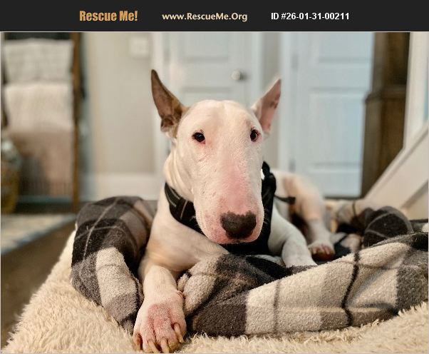 Otis is a sweet, loving, silly, and stubborn English Bull Terrier. He is goofy - loves to lay on his back and wiggle around. He is super chill - one good walk a day keeps him happy, and he'll mostly lounge around the rest of the day. We found Otis as a stray 10 years ago, when he was estimated to be around 3 years old, and he's been a very loved member of our family ever since. Otis is pretty mellow for the most part, with bursts of energy (aka zoomies) that will make you forget he's 13 years old! Otis enjoys lounging around on his dog bed or the couch. In warmer weather, he'll enjoy lounging outside and sunbathing all day. He loves one walk a day - ideally at his pace, which can involve side adventures to plug his head into a bush for minutes at a time. An ideal home for Otis would be adults only, with no children (including visiting children) and no other pets. Otis can be reactive with other animals, so he must be an only pet, and any exposure to other animals should be avoided or strictly on leash with careful management. He is typically very sweet and calm with adults, but he has had a past incident with a small child where play/over-arousal escalated and resulted in an injury. For safety reasons, he needs a child-free home. Otis is house-trained and only has occassional accidents due to his age, but he is very good at using a pee-pad in a designated place when that happens. He is very good on leash for his walks. Otis is neutered and up-to-date on all vaccines. He can have seasonal arthritis, but it is well-managed with a daily anti-inflammatory.