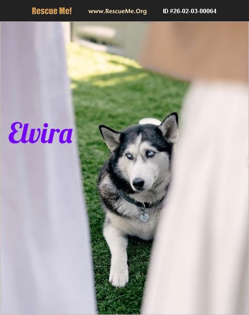 Hello, my name is Elvira. I'm an 8-year-old female husky. I'm super chill for my breed. I get along with other dogs. I am very very sweet. I am not a jumper, but I do enjoy my daily walks. My Previous Owner's had me tied up in the backyard 24 hours a day until I was Rescued. I love all people. I'm also potty and kennel trained. I enjoy my naps during the day in a big yard where I can hang out and enjoy sunbathing.�%A0�%A0I'm looking for a new family, one that will love me for the rest of my days. Will that be you? Ask my rescue for a meet-n-greet!