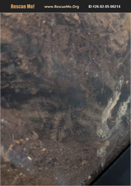 SERIOUS INQUIRIES ONLY, PLEASE. ABOUT: Lexi is a curly hair tarantula of unknown age and unknown sex. She was surrendered to me as her previous owner was deployed in the military and the inheriting family was not prepared to care for her. I work with animals so I'm knowledgeable of its care, but do not personally favor invertebrates as pets. I have only handled Lexi briefly to move her between enclosures or to do wellness checks, but seemingly has a calm temperament. INCLUDES: She comes with a 10 gallon terrarium and screen lid, topsoil substrate with separated drainage layer, and two hides with a water bowl. If you only desire Lexi and none of the supplies, the adoption fee is $0 and I can arrange a deli cup.