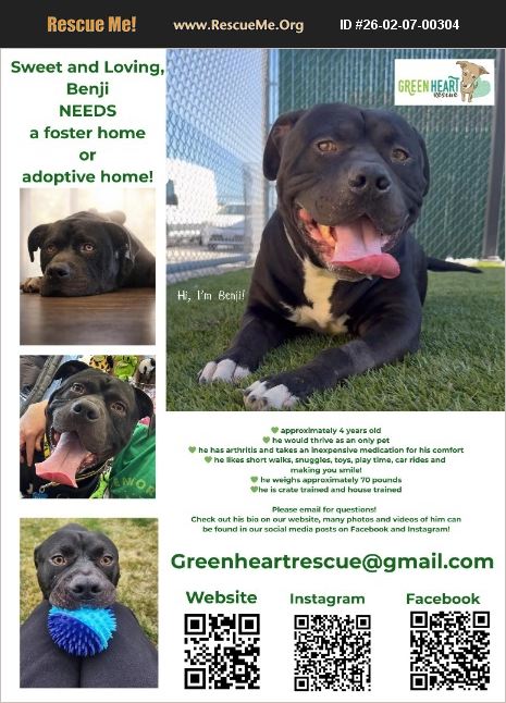 Benji is the sweetest,most adorable,goofy boy. He is approx. 67 lbs who was saved from a high-kill shelter in California just in the nick of time. Benji absolutely loves people, is easy to get along with and very well mannered. Both house and crate trained and he would thrive in a home with no other animals. Benji LOVES to play fetch, go on short walks, and play with toys of all kinds. He LOVES to cuddle. He has an amazing personality and after spending time with him you cannot help be fall in love. Can you open your health to this handsome boy? Benji has needs a forever home.