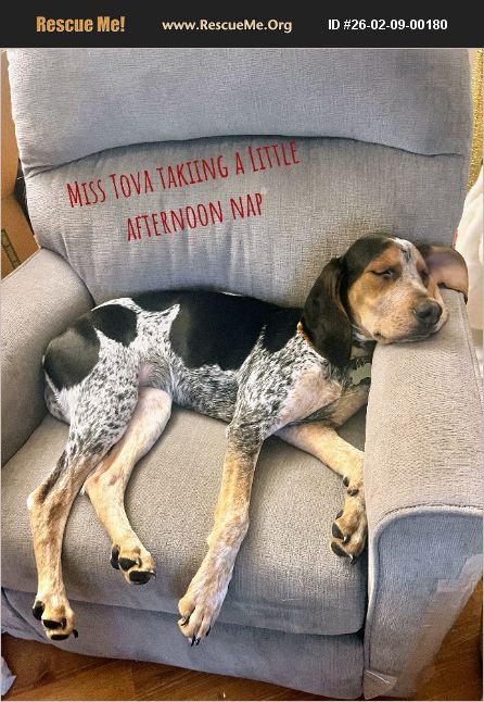 Tova is a beautiful, sweet Bluetick Coonhound puppy! She has been in our home since she was 6 weeks old. She is 5 1/2 month old. She has one blue eye and one brown eye and LOVES to play, give hugs, and gets along with dogs, the cat, and all humans in the house. She is doing great at housetraining. She lives with 3 small lap dogs and thinks she is one too! :) She loves to be the center of attention. She is treat driven! My teen daughter brought her home last fall, all proud to be a new puppy mom, and now we are moving and she is not approved to live at our new place due to weight restrictions. We are so sad but have no choice but to find her a new loving family!