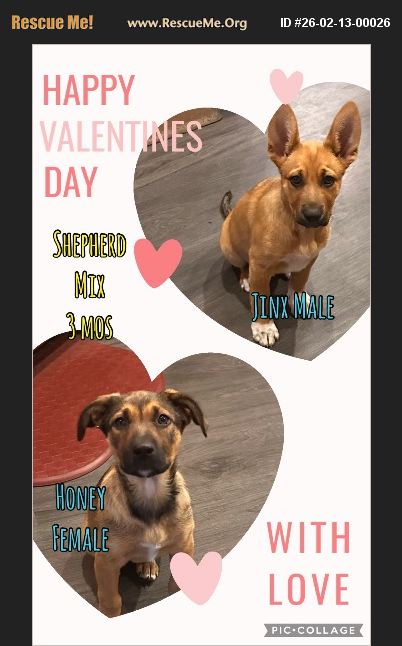 These siblings are a ball of fun. They will need active households and lots of training to make their future bright. Jinx is a male and honey is a female. They are shepherd mixes. They will be large breed dogs and we need lots of room to run and play. They do not need to be adopted together as they are not bonded. And they are $300 each both have been spare neutered had two sets of puppy shots and Microchip.