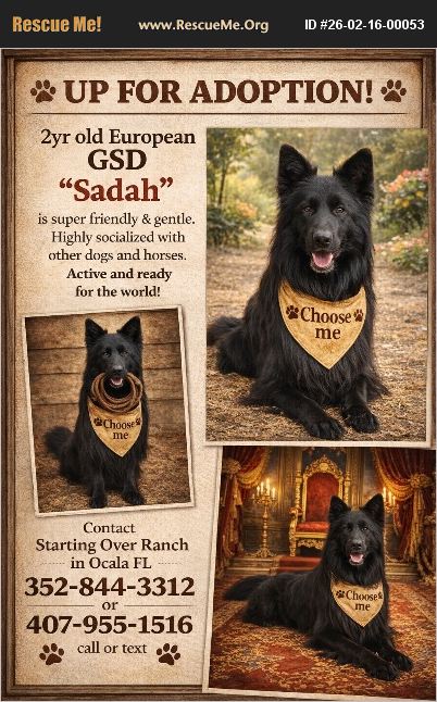 Sadah is going on 2yrs old. He's a special boy. He loves people. Goofy and gentle . Loves to play ball doesn't always bring it back but throws it in the air for himself lol. Sadah was turned over due to his owner being deported. He knows sitz and plotz and go to your place. He knows foos (come) and could advance in his training . He does have the German slope to his body. Please call the numbers listed on his flyer . Located in Ocala FL
