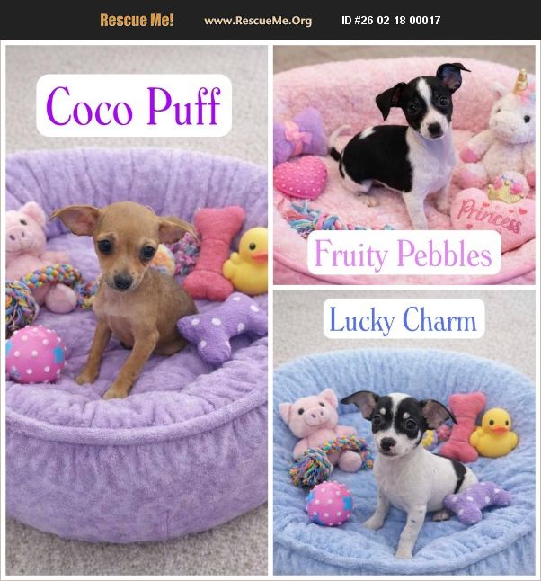 *LOCAL ADOPTION ONLY - Within a one-hour drive to Pensacola FL* COCOA PUFF (f), FRUITY PEBBLES (f), and LUCKY CHARM (m) were surrendered to us by their owner (with two other little girls, who have been adopted.) They were born on November 24th and are cute as can be! This adorable group of Chihuahua puppies is as entertaining as they are lovable. They spend their days playing together, wrestling with toys, exploring everything they can reach, and then happily winding down for snuggles with their people. Several have recently discovered the joy of sleeping in the big bed, while others are perfectly content curled up in cozy dog beds. They currently use open crate/X-pen setups for eating, resting, and potty training. They're doing very well with washable potty pads on a consistent schedule (paper pads don't stand a chance against puppy shredding!). Like all young pups, supervision helps reinforce good habits while they continue learning. Toys, chew bones, zoomies, and cuddle time are daily essentials for this crew. The smallest of the litter, 2.6 pound COCOA PUFF is tiny, affectionate, and a professional snuggler. She loves being close to her person. She plays well with her siblings but prefers calmer interactions with other small dogs. She could do well as an only pup with someone home often or with a calm small companion. FRUITY PEBBLES weighs 2.74 lbs A little timid at first but definitely an explorer at heart, FRUITY PEBBLES loves investigating new spaces and absolutely lives for zoomies, whether chasing her siblings or racing in happy circles. She's wiggly when held and takes a minute to settle, but her playful curiosity shines through. She sleeps quietly in a dog bed overnight and enjoys visiting other puppies for playtime. She would be happiest with a small playmate. LUCKY CHARM is the only boy and weighs 3 pounds. He is sweet, playful, and slightly more cautious than his sisters. He enjoys playing with siblings, chew toys, and downtime on the couch. He tends to bond closely with another similarly sized dog and would likely do best in a home with a small playmate. These puppies are looking for families committed to continued training, socialization, and all the fun (and responsibility!) that comes with raising a puppy. Because of their tiny size they should not go to home with small children or large dogs, but should be fine with older kids familiar with small dogs. They have been to the vet for a wellness checkup, had all three of their puppy shots, and are each microchipped with a lifetime registration. When they are old enough their spays/neuter will be scheduled at one of our vets and is covered by the adoption fee. Because they have pending vet appointments, they are local adoption only. *To meet or adopt one of our dogs, you must first submit an adoption application for review. Important - check your spam folder for follow up questions and responses from our team. Adoption Application-- https://form.jotform.com/232395363383057 *A Place of Hope Rescue is a foster-based rescue located in Pensacola, Florida. We do not have a physical facility for visits. We adopt within a 6 hour drive to Pensacola. Puppies and dogs with pending vet appointments, and dogs with behavioral or medical issues are only adoptable locally (within 1 hour to Pensacola). We do not ship or transport our dogs. To view our adoptable dogs, find adoption fees, submit an application, and learn more about us, please visit: www.aplaceofhoperescue.com