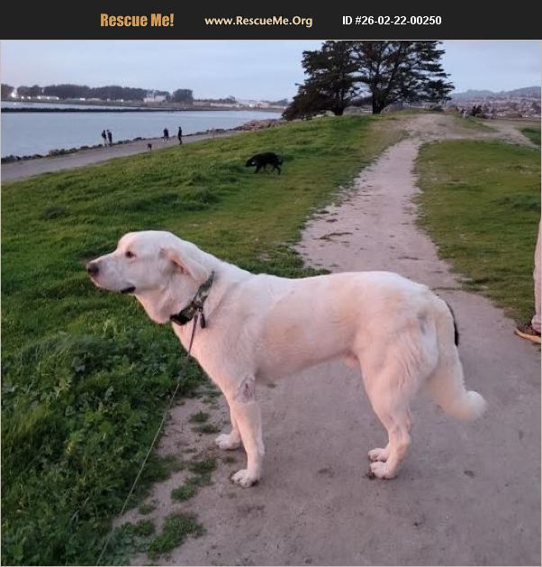 Big Boy is an approximately 4 year-old 130 lb male Great Pyrenes who was found wandering alongside Hwy 101 in San Jose in Feb. 2025 without a collar in the rain. He was neutered but had no chip and no one responded to the 'found dog' notices I posted. He was sweet, loving, affectionate, easy-going, well-behaved, we fostered him for 2 months in Oakland, CA, in a spacious home with a backyard where he enjoyed the companionship of another medium-sized dog. A relative wanted to adopt him so we drove him to San Diego in May 2025, where he unfortunately ended up being confined daily to a small space by himself. Eventually another small dog was adopted to ease his anxiety but some basic needs were not being consistently met. He endured regular confinement over an 8-month period and developed problematic anxiety-driven behaviors. He destroyed household items frequently and started getting dosed every day with trazadone. We re-rescued him and brought him back to Oakland to foster again on February 18, 2026. Immediately all destructive behavior immediately ceased. He is the most wonderful dog and we're searching for an ideal home with a loving family where he will be happy. We are willing to foster him for a few months in the meantime. He loves chasing a bouncy ball but isn't interested in sticks. He is really cute when he tries to make sure you don't stop petting him, he stretches out his paw and touches you to encourage the petting to never stop. Loves having the inside of his ears rubbed. He's just chilling out most of the day! Not at all barky, not overly fixated on food. Big Boy loves walks and naps and snacks. He just wants to hang out with people and have 2 or 3 walks a day. He is very easy-going. Big boy will be happiest with a family that lives in a spacious-enough home, preferably with a well-fenced yard and another dog for companionship. He loves people and affectionate attention. Cannot be confined to small spaces alone. He is gentle and sweet, displays all the best traits of the breed. Family that adopted him for 8 months couldn't meet his needs. Confinement-induced anxiety and isolation led him to act out in destructive ways. The family could not cope so we took him in again. Once his circumstances improved, he had space and was no longer being left in a small room by himself, all destructive behavior immediately ceased. He is housetrained, lets you know when he wants to go out. Sometimes he will pull on his leash when he gets interested in sniffing something. He likes being around people, shouldn't be left alone. Neutered. Up to date vaccinations and current flea/tick prevention. Had recent teeth cleaning. Big Boy exhibits all of the wonderful traits Great Pyrenes are known for. He's very affectionate and gets all goofy-silly with excitement right before a walk. His presence is very calming, his eyes are soulful and his is tremendously loving. no special needs.