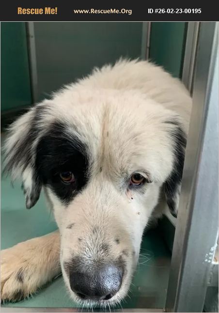 ID#A549152 I am described as a male, white and black Great Pyrenees. The shelter thinks I am about 3 years old. I weigh approximately 60.00 lbs. I have been at the shelter since Feb 19, 2026 and I may be available for adoption on Feb 26, 2026 at 11:12AM.