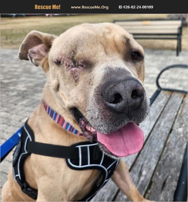 Albie A009750 *In a foster home but needs a forever home* 4 yo Male (will be neutered) Tan & Black Pit Mix Intake date: 1.23.26 *came into the shelter after being hit by a car. He suffered an injury to one of his eyes and it had to be removed*