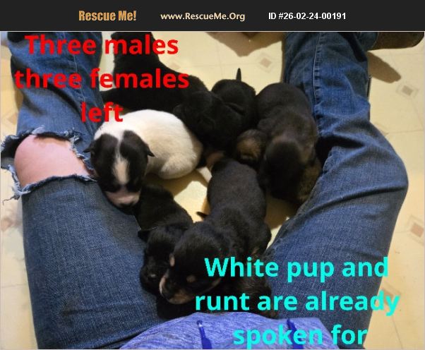 There are six pups left three males three females they are all sweethearts born on 2/4/26 they are 100% free to good homes.