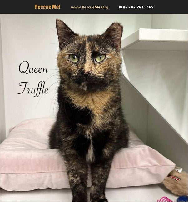 Meet Queen Truffle All hail Her Royal Cuteness! Queen Truffle is a 2.5 year old bundle of sweetness with a playful streak and a heart full of love. This monarch rules her kingdom with gentle purrs, happy zoomies, and an undeniable talent for stealing hearts. Queen Truffle absolutely adores attention. She'll happily trot over when you call her, soak up pets like they're her royal duty, and reward you with the sweetest little purrs. When she's not holding court in your lap, she's busy chasing toys, exploring her surroundings, and showing off her playful charm. She would thrive in a home ready to shower her with love, cuddles, and plenty of playtime. If you're looking for a loyal little ruler to brighten your days and reign over your heart, Queen Truffle is ready to claim her throne in her forever kingdom.