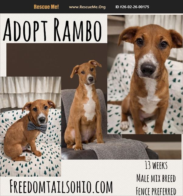 Adopt Rambo Mixed Breed Puppy 15 wks Male Fence Encouraged This stunning pup is the life of the party. Rambo is outgoing and friendly. That tail is always wagging. He is 22lbs and a mixed breed puppy. He is very smart. Learned his name in a day! This big baby loves laying in your arms for a good cuddle. He is working on leash training and potty training, and doing well. He has been neutered, vaccinated and chipped. Will need to continue his puppy vaccine series. He is 3-4 months old. Rambo is ready for adventures with his new family!!! He is game for anything. He infuses the room with positive energy. He is just a happy boy. Great companion. Personality AND heart. Rambo is fostered in Columbus. Please apply at www.freedomtailsohio.com