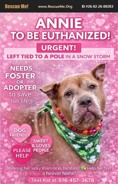 TO BE EUTHANIZED This post is going out with a prayer.A real, desperate prayer that the right angel sees Annie tonight and says 'I'll take her.' Sweet Annie is something special. If you watch her videos, you will see it instantly the light in her eyes, the joy she carries, the way she checks in with her people like she just wants to be loved a bright light !!! But right now, Annie is first on the list. She is a senior.She has a possible medical issue. And because shelter space is limited, she is at risk of leaving in a black garbage bag instead of walking out the front door into love. A rescue is ready to SAVE her but we urgently need a foster or adopter. All medical will be covered. She has some swollen lymph nodes , further testing needs to be done to rule out infection or possible lymphoma , all medical will be paid by the rescue. She moves like a dog half her age. She has life in her. She wants to live. And she deserves to live out her golden years . Annie is 11 years old. She was found tied to a pole in the freezing cold while her owner walked away without looking back on a snowy day !! Imagine the confusion. The heartbreak. The betrayal. She cried and barked as the only person she knew disappeared into the night. She has already endured the unthinkable. Yet she still loves. She adores people. She loves pets, treats, and walks. She trots happily on leash. She checks in to make sure you're still there. She handles affection beautifully and has polite manners with other dogs. Shelter life makes her a little anxious, but give her patience, kindness, and a soft place to land and she will blossom. She is a gentle, tender-hearted soul who lives in the moment. She is not acting sick. She is not giving up. Please don't let her story end like this. Please don't let Annie die because of space. Look at that face . If you can foster or adopt even short term you could be the reason she gets to spend her golden years wrapped in love instead of fear. Text Kat at 516-457-3678 and I will send you all the adorable videos so you can see the joy and bright energy that shines straight from her soul. Be her angel. Be the one who says YES. Run to the Rescue Where Love and Peace Will Follow.