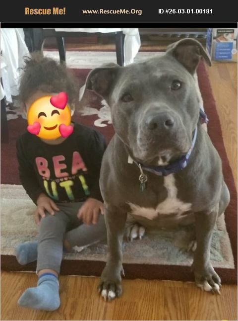Sapphire is a 13y/o Blue Nose Pitbull. We've had her since she was just a pup, but due to fortunate & unfortunate events, we are unable to keep her and would rather her go to a home that can show her the attention and love that she needs. She is great around people and children. Loves to play with other dogs and even small dogs. Never bit anyone and only defends herself if need be. She is a true nanny dog. As any older big dog, she has rear leg issues that prevent her from long walks. She can get up the stairs, just takes her a little bit longer. She has 2 fatty lipomas, non-cancerous, on her left side and her tail; they have never affected her though. It is the hardest thing to give her up, just don't want her going to a shelter. I will cover the adoption fee donation to Rescue Me!
