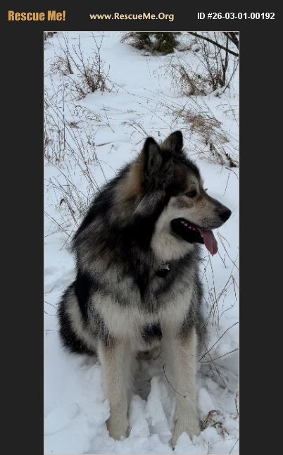3 year old neutered male malamute. Wooly coat, agouti coloring. Healthy around 130lbs. Some aggression issues with random people. Gets along fine with some dogs but not others. Never been around cats. Surprisingly good bird hunting dog. Will require a strong owner with experience and no children.
