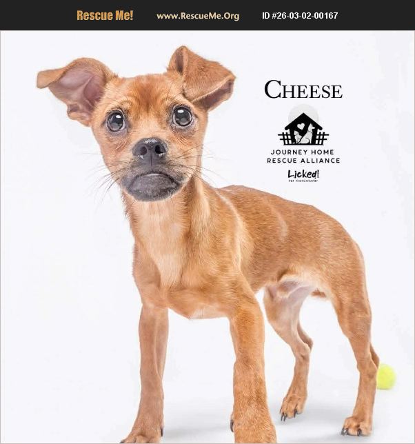 Cheese is an approximately one year old 15 pound Chihuahua mix with a huge personality packed into a tiny body. He is house trained and happily uses a doggie door. He loves walks, outings to the park, and being part of everyday life. He does not enjoy being crated, but he does just fine having free roam of the house when left alone. More than anything, Cheese loves his person. He bonds deeply and will be incredibly loyal. Because of that, he can be a bit jealous and protective, and tends to choose a favorite who he keeps a close eye on and protect. He is happiest in a calm, predictable home and may do best with someone familiar with Chihuahuas and their behavioral needs. He is playful, energetic, and full of spunk. He loves to snuggle and will happily burrow under the covers to be close to his person at night. Like many small, smart dogs, Cheese can get overstimulated when there is a lot going on. When that happens, he may bark or get a little mouthy such as grabbing at pant legs or socks and can be a bit nippy. With structure and continued guidance, he is still young and very capable of learning better coping skills. His foster family absolutely adores him and wants to make sure his next home is the right fit for his personality and needs. In the right environment, Cheese will be an incredibly devoted and fun companion. Cheese would do best in a home with: - No cats as he tends to chase them - No children due to overstimulation - Another confident, stable dog who will not let him run the show and can help keep him balanced