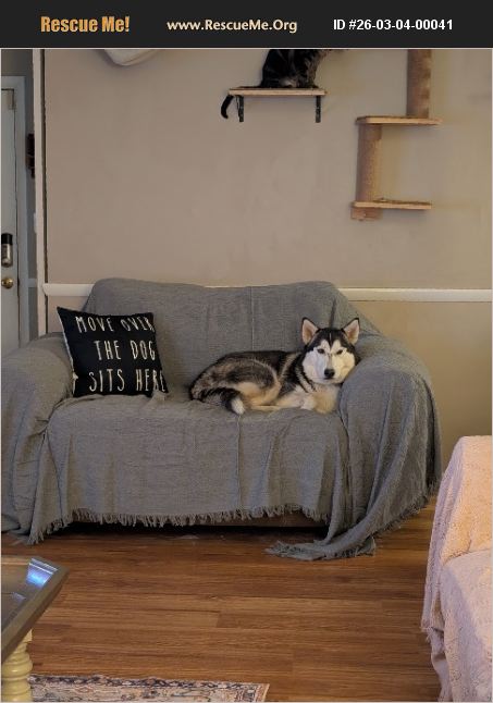 This animal is available to licensed rescue groups only. Please do not enquire unless with a licensed rescue group. Meeka is a full blooded husky. She will be 2 in pay. She is a very sweet girl with lots of love and energy. She is great with other dogs and cats. She needs a home with a large fenced in yard where she can run and play and a family with a more active life style. My husband and I work full time and she spends most of the day in her cage which she does fine but then often back in due to having kids and all their activities. I would love to see her go to a home with another dog. She is spayed and up on her shots.