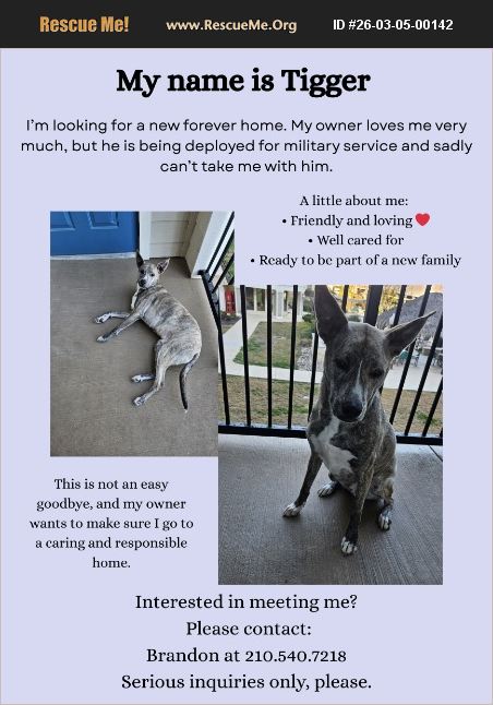 Tigger is a two-year-old gray, black, and white brindle with an exceptional temperament and intelligence. He is remarkably affectionate and thrives on human interaction, consistently demonstrating a friendly and welcoming disposition toward both people and other dogs. Highly social and playful, Tigger enjoys engaging with others while maintaining excellent behavioral control. He is extremely well-trained and obedient, responding reliably to commands and exhibiting a level of attentiveness and cognitive ability that sets him apart as the smartest dog I have ever owned. Beyond his intelligence and discipline, Tigger's defining trait is his loving nature-he genuinely enjoys giving and receiving affection and is always eager to snuggle and be close to those he cares about.