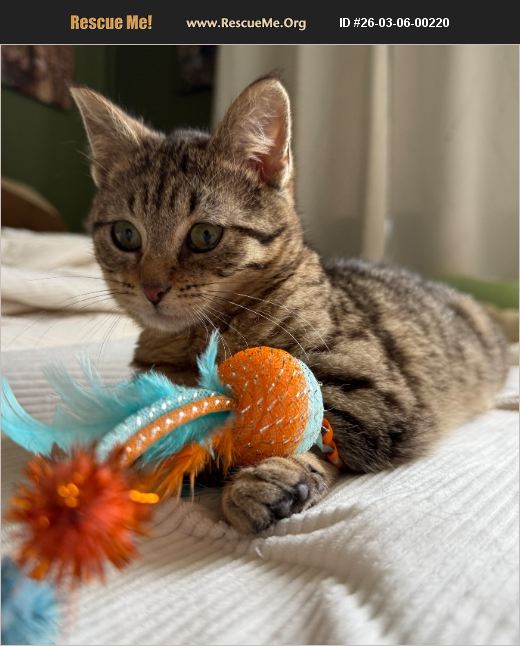 Meet ELMER, affectionately known as Gluestick: small kitten, big personality, and absolutely no respect for the safety of blanket-covered feet. Elmer is a 4-month-old brown tabby with a big personality packed into a tiny kitten body! This handsome little guy came to WCAS as a stray after being discovered hiding out in a chicken coop - likely looking for a warm place to nap and maybe hoping a snack would magically appear, too. Safe to say, Elmer knows how to make the most of an opportunity! When Elmer first arrived, he was a bit timid about the big, unfamiliar world around him. But even then, one thing was clear - his love for affection was stronger than his fear. With some time in a wonderful foster home, Elmer has been learning that people are pretty great and that life can be full of cozy naps, tasty meals, and lots of playtime. His confidence has grown more and more each day! Once Elmer feels at home... watch out! This kitten transforms into an absolute menace in the best possible way. He's spunky, goofy, and endlessly entertaining. Elmer loves toys and will happily chase anything that moves! He's also a big fan of the classic kitten pastime: attacking mysterious hands and feet under blankets with dramatic flair. Elmer spent some time in a loving foster home with lots of furry siblings (dogs and cats) - suggesting he would do well in a home with other animals as long as proper, slow introductions are performed! He is neutered, up-to-date on vaccinations, microchipped, dewormed, and FIV/FeLV negative. If you're looking for a playful, affectionate kitten who will keep you laughing and fill your home with fun, Elmer might just be your guy. All he needs is a loving home where he can continue growing into the confident, silly cat he's meant to be. Please fill out an adoption application on our website - for any additional information or questions, please contact the shelter at [email protected] or (920) 279-9795.