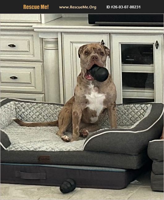 Nya is a 2.5 year old bulldog. She is spunky, loves her toys and will play fetch/'ball' all day long, though she'll slow down when she gets tired. She's approximately 40 lbs and has Merle coloring - light brown with dark brown spots. She has been spayed. She had a rough start to life and was abused by young adult males, so she's initially leery of new males she meets, but has gotten better since we've had her. She has hip dysplasia, a torn ACL in her right knee and a partial ACL tear in her left knee. But that doesn't stop her from playing fetch both indoors and outdoors. She takes an anti-inflammatory and joint medicine daily and has responded to these very well. And she snores louder than any dog her size should, ha ha. She is fully potty trained and loves treats. She knows 'sit', 'lay down', 'pillow', 'roll over' and we're working on 'stay'. She walks well on a leash also.