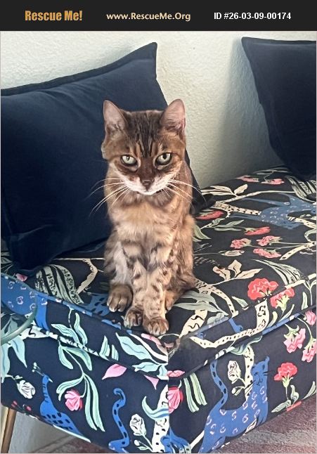 Beautiful purebred Bengal cat with a very friendly, affectionate, and people-oriented personality. She loves cuddling, being pet, and spending time around her humans. Curious and brave, she'll often walk right up to new people to say hello. She's also quite chatty and enjoys 'talking' with her humans. She naps sometimes but also has playful bursts of energy and loves interactive play, so she does best in a home that can give her attention and stimulation.