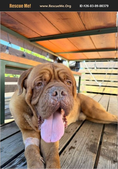 Hercules is a 7-year-old Dogue de Bordeaux, also known as a French Mastiff, weighing about 100 pounds. True to his gentle nature, Hercules is a mellow, easygoing boy who enjoys the simple things in life. Most of his days are happily spent lounging nearby, keeping his people company and soaking up the calm of the home. He enjoys getting out for a nice walk to stretch his legs and burn a little energy, then he's perfectly content settling back in to relax for the rest of the day. Hercules also seems to really enjoy bath time. He has shown himself to be gentle around larger animals, including other dogs, horses, and ponies. Small animals are not a good fit for him, and he does best in a home where he doesn't have to be crated, as he prefers being able to relax freely. Hercules is the kind of dog who just wants a peaceful place to call home, where he can spend his days enjoying good meals, gentle pets, and the quiet comfort of being loved. If you're looking for a calm, loyal companion with a big heart and an even bigger head, Hercules may be your guy.