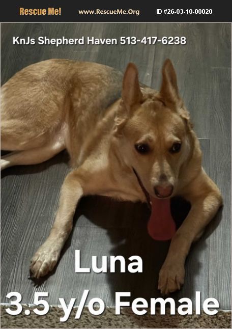 APPLY HERE: TO ADOPT, APPLY HERE: https://docs.google.com/forms/d/e/1FAIpQLSftfJ3aixd0OY8rysxPW0DL1p-swDSrE3k7E8tt_pu7dM2xHQ/viewform?usp=header CONTACT ME: 513-417-6238 or EMAIL: [email protected] Trying to keep this amazing breed OUT of shelters, so please HELP me by SHARING this post and/or sending to anyone that may be interested in adopting. IT TAKES A VILLAGE, AND YOU ARE MINE. Those of you that rescue/adopt these Shepherds in need instead of paying a Breeder, YOU are the REAL TRUE HEROES. Thank you so much��%A4%8D. DISCLAIMER: Every effort is made to provide the most accurate representation of each shepherd. While I disclose all information provided to me, KnJs Shepherd Haven cannot guarantee the completeness of a Shepherd's prior history. I provide all known details in good faith to ensure a successful match. [Case opened on March 10, 2026]. URGENT! Columbus, OH (willing to drive up to 2 hours). 3.5 Y/O FEMALE Shepherd/ Malinois Mix (DOB: 05/?/22). Her name is 'Luna'. Background: Luna has been with her Current Shepherd Parent since she was a puppy, originally coming from a friend. She has been raised in a loving home but is looking for a new family due to a change in her parent's work schedule. NOT UTD on shots WITH record. NOT Fixed. Good with kids. Good with dogs. Unknown with cats. House trained. NOT Crate trained (She is a 'free-roam' girl and does not currently use a crate). Any known medical issues?: None. Abuse/Neglect/Trauma History?: None. ENERGY LEVEL: Medium. PREY DRIVE LEVEL: Medium. Weighs 50 lbs. Currently on Purina One food. Good with car rides?: Yes. Socialized with: people?: Yes. dogs?: She has always been good with other dogs, but has not been socialized with them recently. Good with meeting new people? (ALWAYS USE PROPER INTRODUCTION\!): Yes. Loves: Fetch, attention, food, cuddling, walks, playing with kids and dogs, balls, sleeping in bed with her person, and being near her person, treats. *Intelligent and knows Basic Commands?: This breed is super intelligent. *Good Recall? (ALWAYS RETRAIN BEFORE ALLOWING OFF LEASH): Yes, her recall is good. *Good on a Leash?: No, she will need some continued training in this area. *Lovable?: This breed is super lovable once they claim you as their person/family. *Eager and fast learner?: This breed is super fast learners when they are being committed to and worked with. Bite History?: None. NOTES FROM CURRENT SHEPHERD PARENT: 'She is an energetic love bug!' Re Homing because�'�|: Her Shepherd Parent's work schedule has changed and she no longer has the time that Luna needs and deserves to truly thrive. Luna will be a great companion for the right person. Will thrive best�'�|?: In a loving Furever Home where she can get plenty of attention and exercise. Comes with: Collar, leash, bed, food, and toys. RehomingFee $175. ***If not on Facebook, please text me for more pics and full Profile.*** *Serious Inquiries, please APPLY HERE: https://docs.google.com/forms/d/e/1FAIpQLSftfJ3aixd0OY8rysxPW0DL1p-swDSrE3k7E8tt_pu7dM2xHQ/viewform?usp=header Thank you. Would you like to donate to a great cause? Any help is so much APPRECIATED and NEEDED. (We are NOT 501c) Help US to help THEM��%A4%8D Tysm. \#ItTakesAVillage LINKS TO DONATE: Amazon WishList: https://www.amazon.com/hz/wishlist/ls/1D1I1QOVAGR4H?ref\_=wl\_share](https://www.amazon.com/hz/wishlist/ls/1D1I1QOVAGR4H?ref_=wl_share Walmart WishList: https://www.walmart.com/lists/shared/WL/6214b31a-4919-4d0a-868e-b75e6bace5e0](https://www.walmart.com/lists/shared/WL/6214b31a-4919-4d0a-868e-b75e6bace5e0 Venmo: https://venmo.com/code?user\_id=2889571939385344656\&created=1767974792](https://venmo.com/code?user_id=2889571939385344656&created=1767974792 CashApp: https://cash.app/$KnJsShepherdHaven](https://cash.app/$KnJsShepherdHaven PayPal: Keren Lainhart [email protected] 513-417-6238 KnJs Shepherd Haven 513-417-6238 [email protected] Text/Call: 513-417-6238. Please JOIN OUR GROUP: https://www.facebook.com/groups/593859788742255/?ref=share](https://www.facebook.com/groups/593859788742255/?ref=share