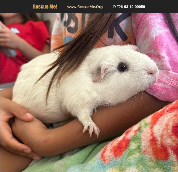 Approximately 3 years old female all white guinea pig. With 2 other guinea pigs. Moving and can't take with us. Will come with Blankets and bed.