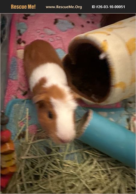 Light brown and white 6 month old female guinea pig. Raised with 2 other guinea pigs. We are moving and can't take them with us. Will come with blankets and guinea pig bed.