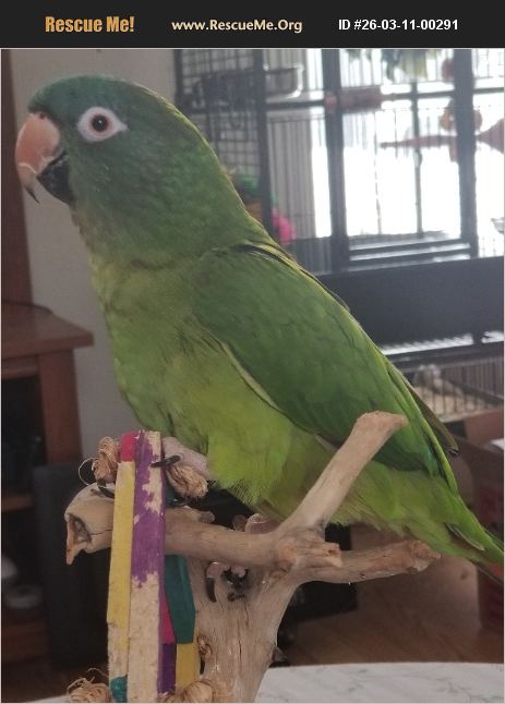 Cleopatra is a DNA sexed female blue crown conure. She is a silly girl who laughs. She says phrases such as 'watch'a doing?' and 'pretty girl Cleo' Adoption fee is to ensure she goes to a good home.