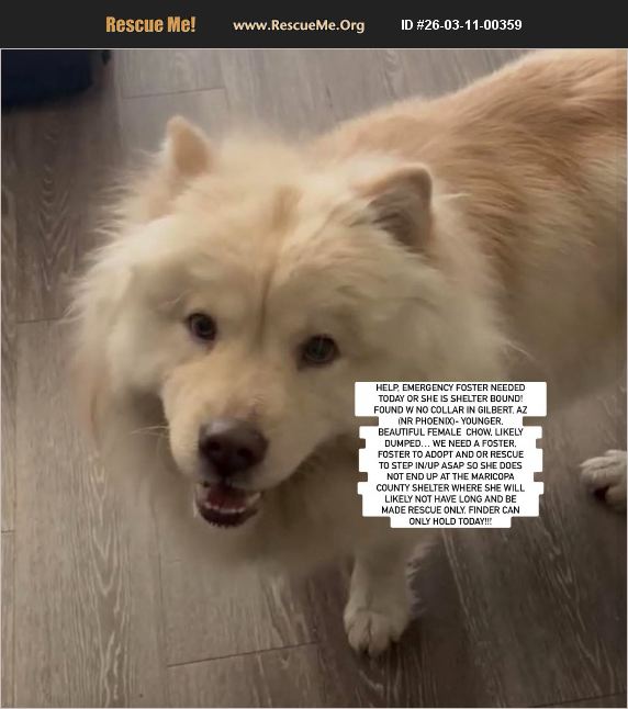 Courtesy Posting: Help, emergency foster needed today or she is shelter bound! FOUND W NO COLLAR IN GILBERT, AZ (nr PHOENIX)- younger, beautiful female chow, likely dumped�'�| we need a foster, foster to adopt and or rescue to step in/up ASAP so she does not end up at the Maricopa County shelter where she will likely not have long and be made Rescue only. Finder can only hold today!!! A Good Samaritan found this girl 3.6 running scared and was finally able to get her in her car, and later her apartment. She was very scared and shy initially, but has since warmed up. She now allows some handling and interacts well with the finder's male dog. However, the finder's landlord wants her gone today. Please note posts on social media have been up for several days and no owner has been found. We are therefore calling her Honey. We are now in desperate need of an immediate foster, or even temporary foster, in the general area, and or a rescue so the finder does not need to take this shy girl to the county shelter where she will be at great risk and probably not made adoptable due to being a chow who is wary of strangers. A foster to adopt situation would also be considered. We are looking into someone who can sponsor vaccinations, and spay. We can also raise additional funds for a rescue group, but a foster is needed now so she has a place to go. Chow experience would be ideal, as she is shy and wary of strangers like many chows, but warming up already. We also have several nice videos of this Honey girl interacting with other dogs. If you may be able to foster, even temporarily, or help in some other way (transport, pledge towards his rescue and medical), please contact Southern California Chow Chow Rescue Network ASAP at [email protected] who is trying to find immediate placement for dear Honey. Time is of the essence. She cannot be sent to someone however unless you are backed by a rescue group, and only after a legal stray hold ends. We will be posting more pictures, videos and updates also on facebook at: https://m.facebook.com/story.php?story_fbid=10168656518473125&id=783968124&mibextid=wwXIfr Note: to view contents of link you will need to copy and paste it into your browser.