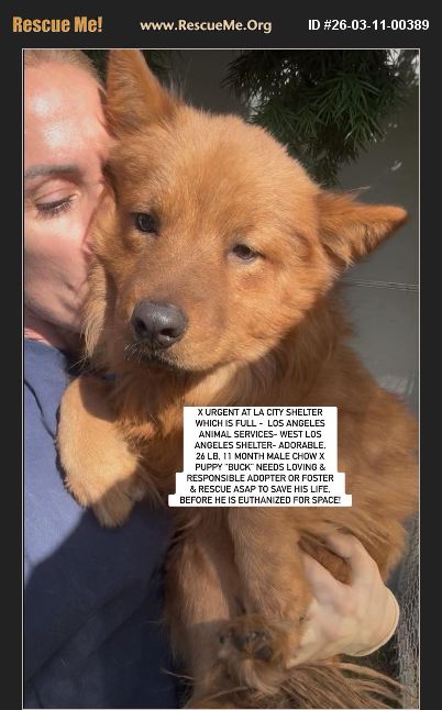 Courtesy Posting: X URGENT AT LA CITY SHELTER WHICH IS FULL! LOS ANGELES ANIMAL SERVICES- WEST LOS ANGELES SHELTER- ADORABLE, 26 lb, 11 MONTH MALE CHOW X PUPPY 'BUCK' ID #A2254443 NEEDS LOVING AND RESPONSIBLE ADOPTER OR FOSTER AND RESCUE ASAP TO SAVE HIS LIFE, BEFORE HE IS EUTHANIZED FOR SPACE! Help! This LA City shelter is full, and has already issued a warning on 3/10 of possible future euthanasia for this dear puppy. Poor Buck was found as stray and very scared upon intake, but has warmed up to staff and can be seen in videos enjoying being cuddled, as well as interacting gently with other dogs . He is estimated said to be only 11 months old and weighs 26 lbs, and appears to be a smaller chow mix. The recent shelter notes we were provided state: 'He is a sweet, scared boy who feels somewhat threatened when someone just tries to forcefully leash him. He requires a slow and gentle approach. He enjoyed the fresh air and the sun. We then went to spend more time in the small yard. He hid underneath the bench but I didn't try to force him out. Today I leashed him after I entered his cubby from the front instead of from the back. I just got down to his level and gently leashed him. He is just scared. We went to the side yard to get some fresh air while DPFL was in lunch break. Buck wanted to stay in the training kennel so I just let him do what he wanted after he relieved himself.' A complete list of both medical and behavior notes can be provided upon request. Please note Buck recently finished a quarantine after a volunteer cornered him and he bit her finger in fear. While this bite requires no stitches, the incident has caused young Buck to be placed on the shelter's urgent list where he could be soon placed on the shelter's euthanasia list soon. The shelter issued a warning on 3/10 and is asking for help. This sweet but shy young man can be adopted or rescued through the shelter but will require the entity to sign a bite disclosure. He was just neutered by the shelter and is ready to go home. If you are interested to adopt or rescue young Buck, please contact the shelter directly by calling or using the listing link or by calling (888) 452-7381. Listing link: https://24Petconnect.com/DetailsMain/LACT2/A2254443 If you can foster for a rescue, please contact [email protected] asap or Southern California Chow Chow Rescue Network who is trying to assist the shelter with his placement. Please note rescue groups typically need a foster to save a dog. We will then try to pair you with a willing rescue group in time. His listing link has been pasted into the comments section of this post. We will be posting additional pictures. Videos and updates as we receive such on Facebook at: https://m.facebook.com/story.php?story_fbid=10168657356593125&id=783968124&mibextid=wwXIfr Note: to view the contents of links you will need to copy and paste each one separately into your browser.